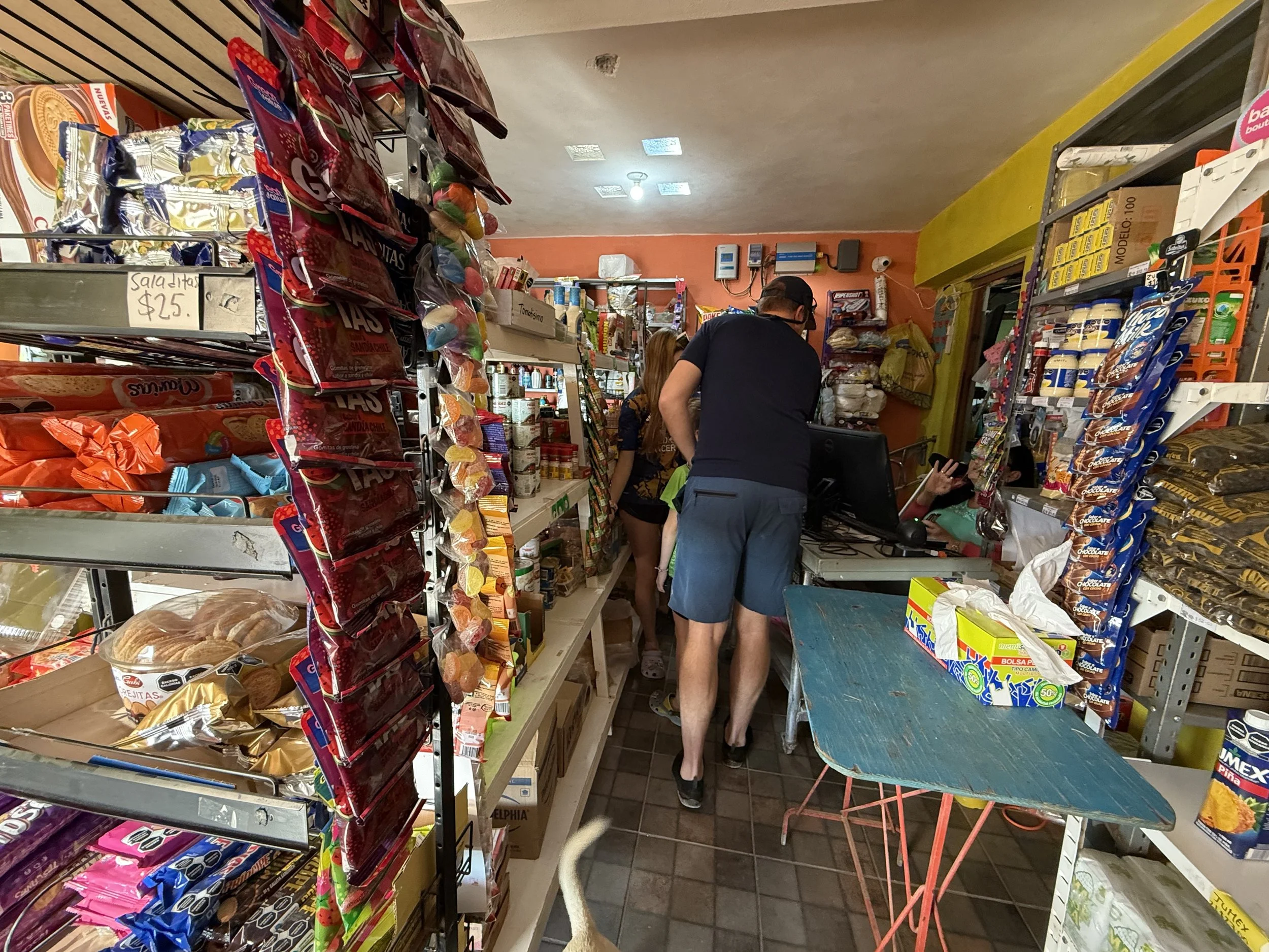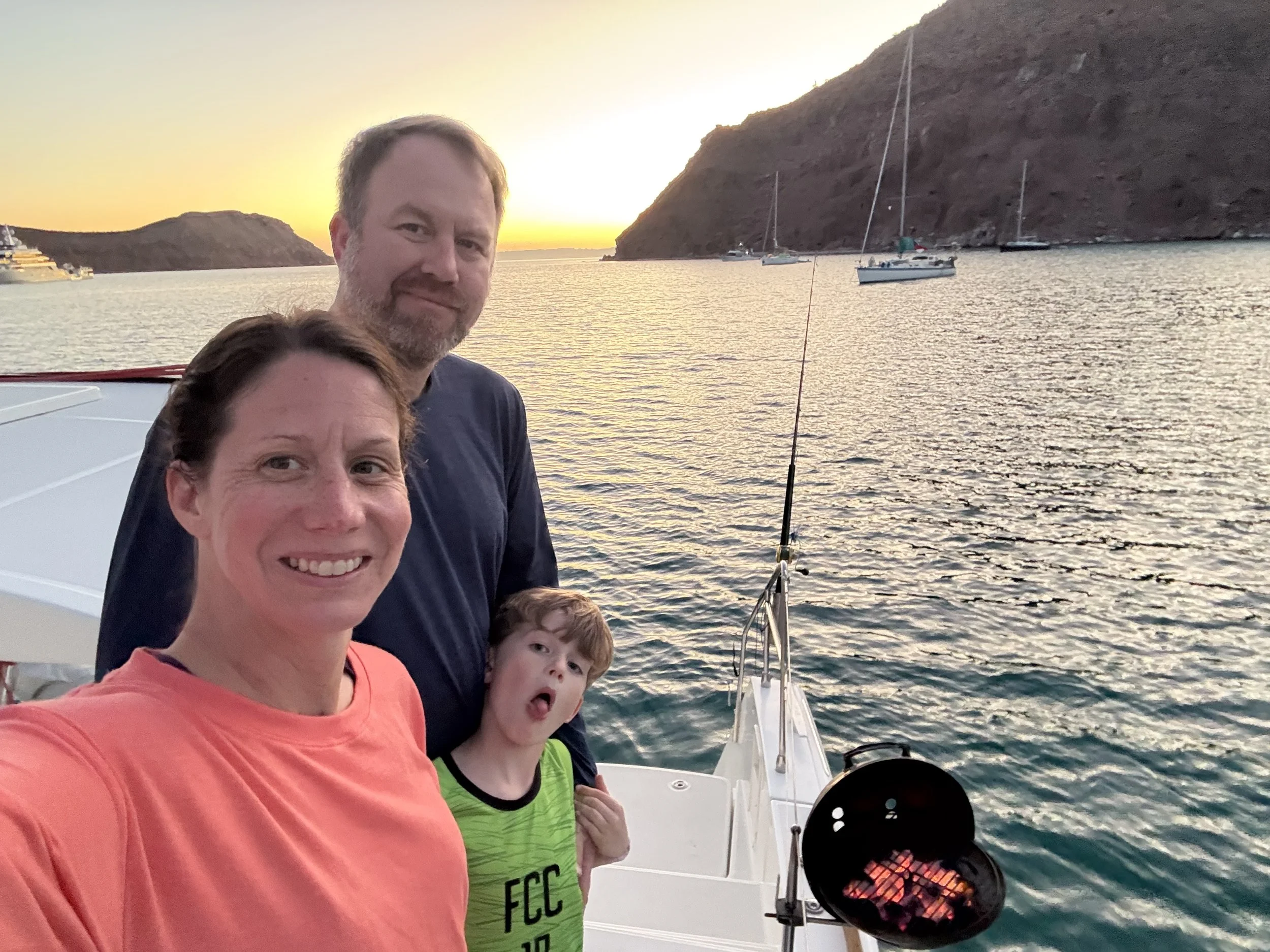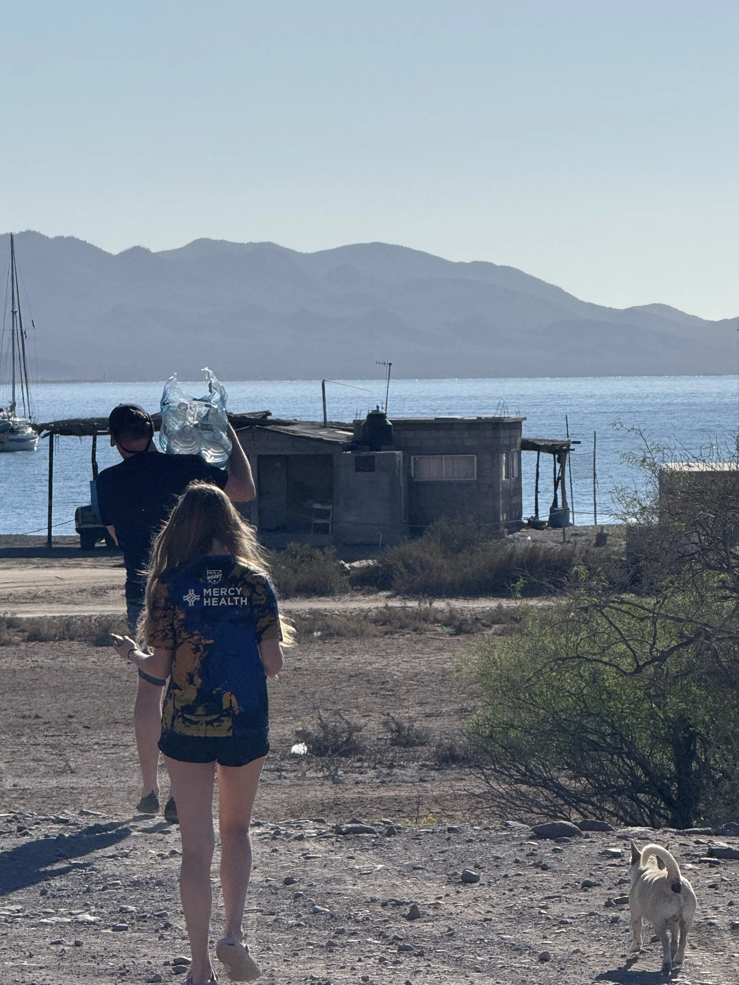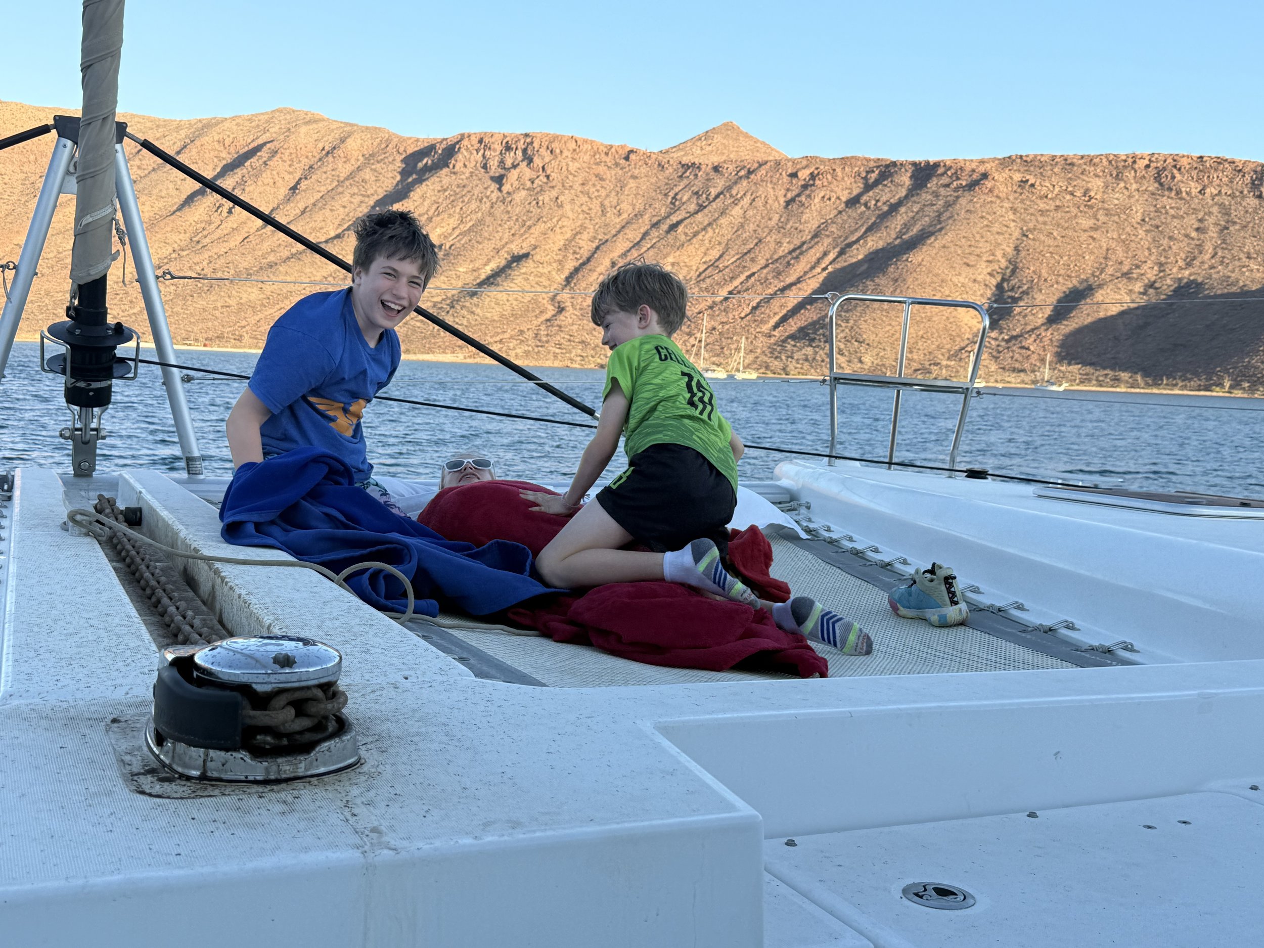 This was an early sailing morning with decisions to be made. With a leaking water tank and a non-functional water maker, could we purchase enough water to hold us over for the next 4 days and 3 nights? As we contemplated the issue at hand, we enjoyed some coffee and saw another whale spout water on a beautiful, quiet morning. We eventually decided we would make it work with jugs of water. The five of us went to land in search of the tienda. We walked around and used google translate to eventually find a tiny but stocked grocery store called Gigi. We could either get a huge 20 gallon tank that they could transport to our dinghy but we would need to get it onto our boat. Or we could carry individual gallons, which we ultimately decided to do. The short walk to the store seemed a little adventurous and made me want to explore the town further. I cannot wait to go back. Back at the boat we met a sailor who splits his year between Colorado and Sea of Cortez. He said that San Evaristo was one of his favorite spots and told us that he will sometimes take out the dinghy at night to stir up all the bioluminescence in a trail behind him. He also offered some fishing advice to the boys and shared some bait!