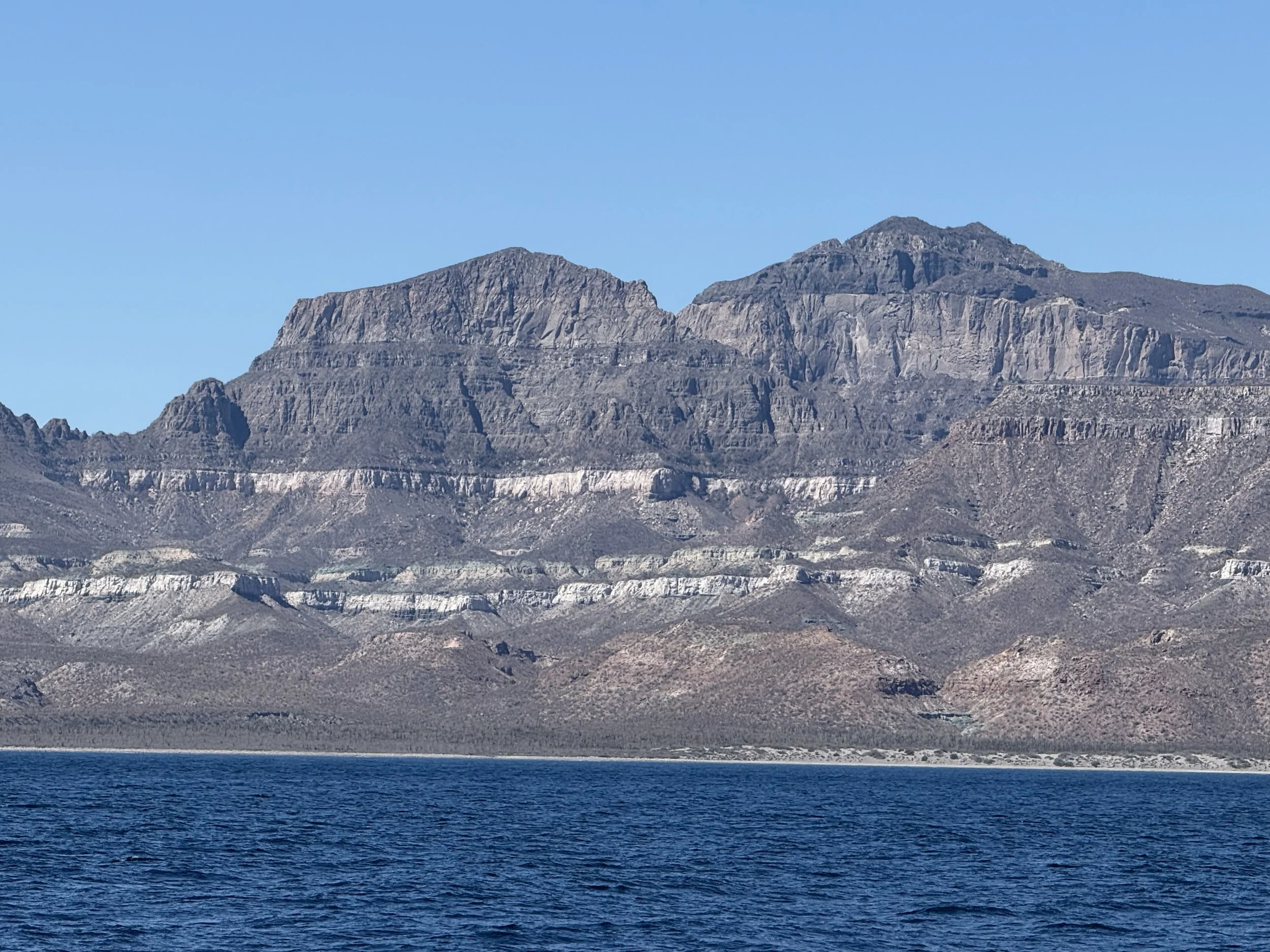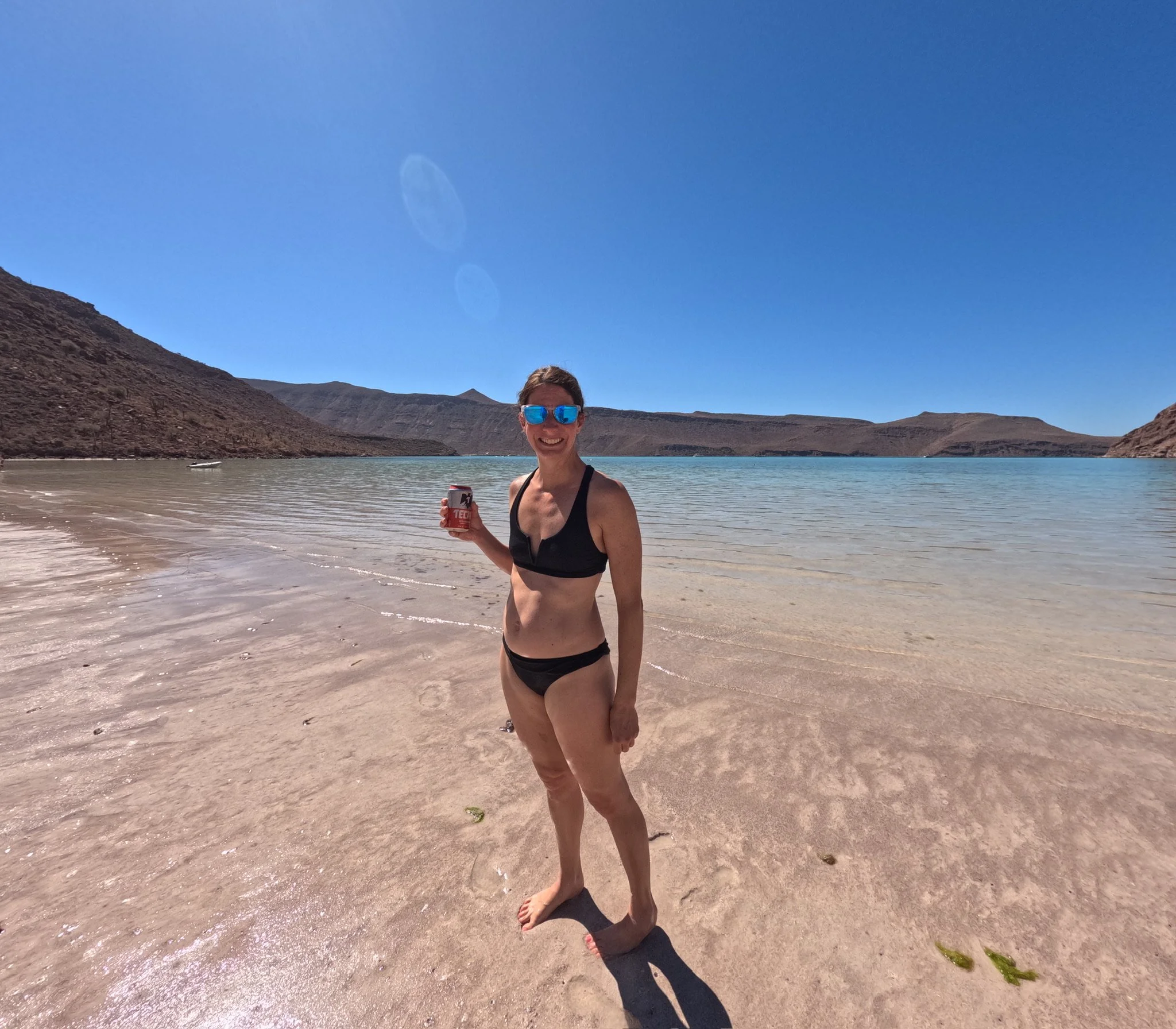 We headed over to Balandra, our planned lunch stop for yesterday. As we rounded the bend, we were greeted by a huge pod of dolphins and a stunning view of the Baja mountains. It really felt like something out of the movies; like these dolphins were there to greet us to this magical place. The Sierra de la Laguna mountains tower over the bay. They are a rugged mountain chain standing at >6800 feet. Cliffs and giant rocks line the edges and blue green shallow water is rippled with sand patterns on the ocean floor.