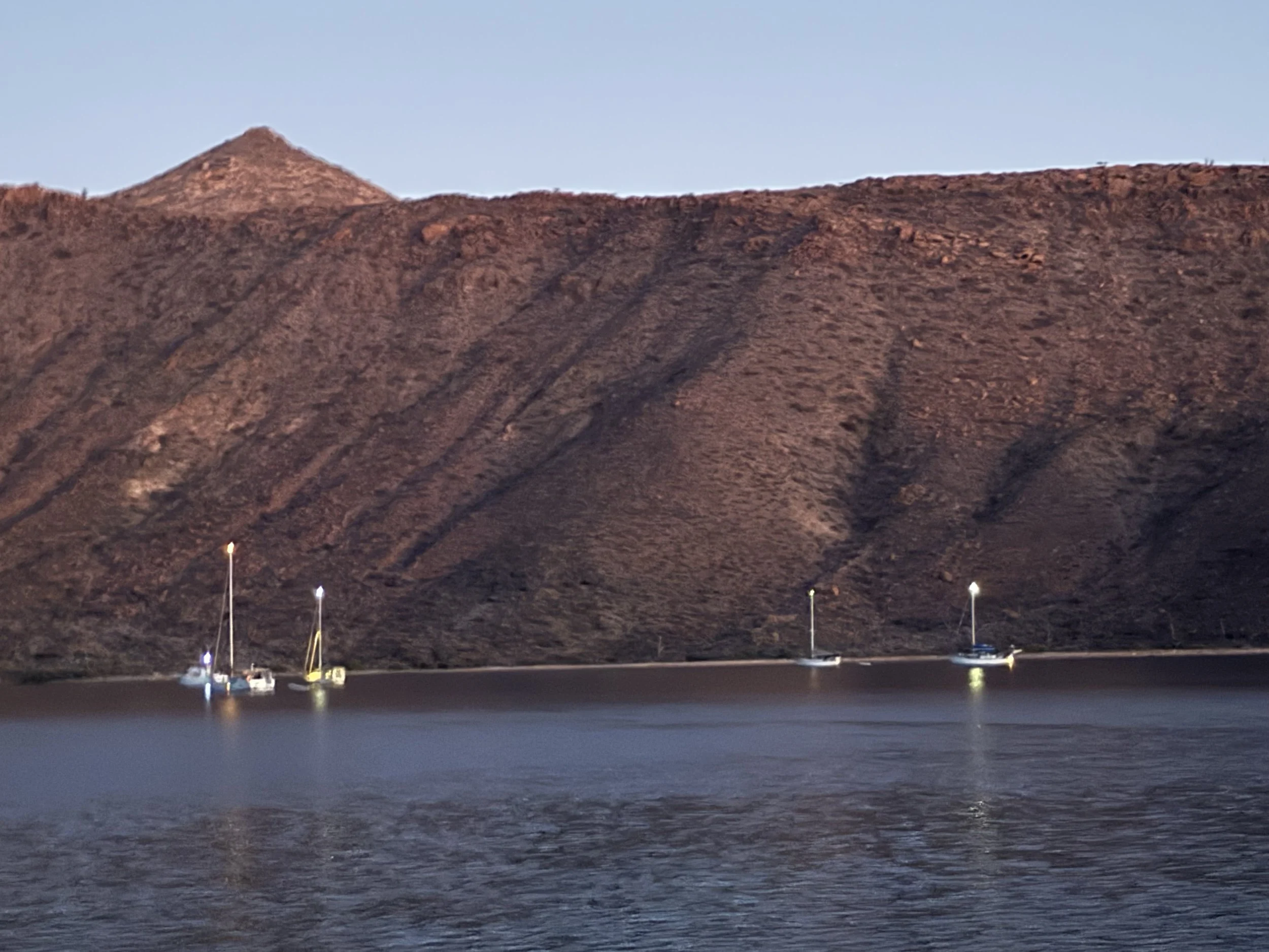 We sailed towards our destination for the night on Isla Espiritu Santo, approximately 15 NM from Balandra. The wind was low but our spirits were high to be headed towards the UNESCO World Natural Heritage Site. Once we lined up with land, we were transfixed by the rock formation produced by volcanoes. Of things that I have seen, it was probably closest to the Grand Canyon in color but the textures were so variable, at times smooth and burnt orange and at times it looked like a kid put some glue on a giant rock and stuck it to the side of the mountain. I understand when I read the description of Espiritu Santo’s formation by a “violent” volcano. There is evidence in the form of pearl oyster fishhooks that humans lived on this island over 9000 years ago and you can almost picture it.