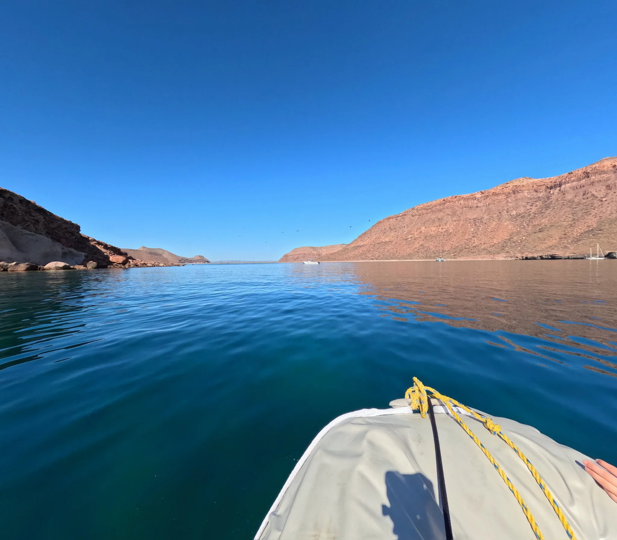 We woke up, had coffee, put on our dry suits and headed out to explore. We saw beautiful isolated beaches at the base of the cliffs surrounding the caldera. There was a river that connects the east and west coasts between Espiritu Santo and Partida and at high tide (and honestly, probably at low tide), you can dinghy through it. We found the entrance to the river just to the south of a few kayaking shanties and a ranger office on a beach. Once we got through to the other side, we admired tall cliffs and some crazy cool, varied earth surfaces. We joked that this side of the canyon looked like a toddlers art project, with many different materials and rocks glued to the edge in random places. We dinghied about 1.5 km until we found the caves, where Alex and I jumped out to snorkel. The cave itself was very cool and we saw a few puffers and a handful of fish. There were crabs crawling on the rock at the entrance to greet us. We saw more fish around the outside of the cave than in the cave!